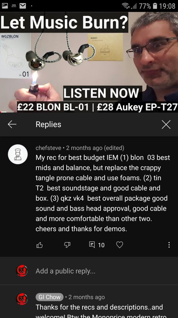 So, he really likes it though keeps it real by saying there are earphones above $100 that sound better i.e. this isn’t a ‘giant killer’ which even the Blon BL03 has been touted as, e.g. by one of the most popular audiophile reviewers Z Reviews in this review.