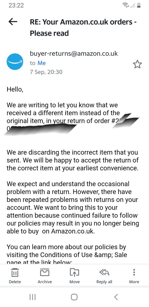 Once again I told them via a phone call with an Amazon call centre real human being (after first conversing with a bot) that I had already returned the item and also emailed a photo of the Hermes receipt that I was handed when I left the return package at the Hermes drop off point in my local Co-op supermarket. Luckily, or so I thought, I had kept the receipt – even though I had to hunt for it at the bottom of my rucksack! Though with the scanning of my returned package and subsequent refund I thought they must already have had evidence of this.