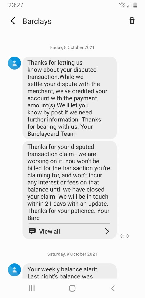 which I had to print out (I had technical issues printing it but that’s another story) and then post via snail mail back to them, I received this phone text message from the credit card company: