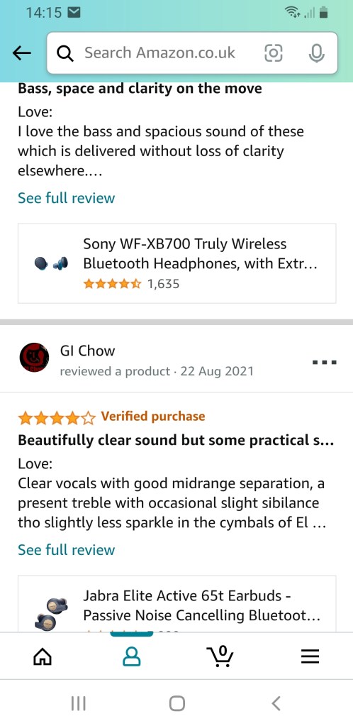 When looking for a mid-priced wireless earphone with good sound quality for sports and outdoor use I ordered the Jabra Elite Active 65t and the Sony WF-XB700 (a discounted ‘Amazon Renewed’ item). Both of these I’ve reviewed on Amazon, which can be found under my profile GI Chow with affiliate links to them here.