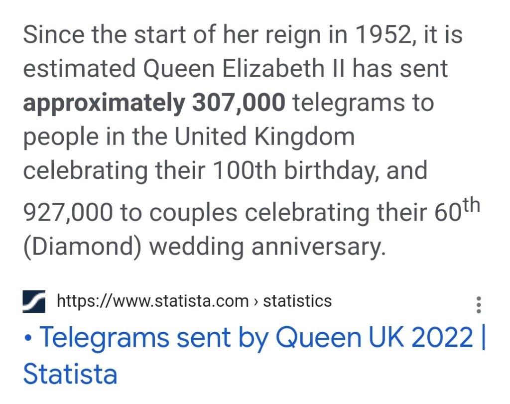 If we include the 307,000 people she sent a 100th birthday telegram to and the 927,000 couples she sent a 60th anniversary message to that brings the figure up to 2.6 million people in total (alive or dead) she has directly communicated with, though this is an overestimate since there will be overlap between these these cohorts.