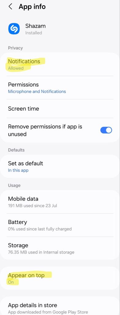 - Change your phone’s Shazam app permissions to allow the permissions Shazam needs: “Notifications” and “Appear on top”.