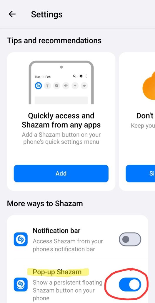 - Click the cog, scroll down to “Pop-up Shazam” and slide the toggle right to turn it on