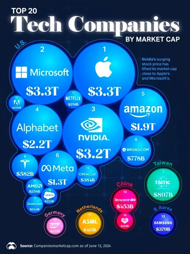 US Technology companies include household names like Microsoft, Google/Alphabet, Amazon/AWS, Apple, Meta (WhatsApp, Instagram, Facebook), YouTube, X, Salesforce, Netflix, eBay, OpenAI, Oracle, Nvidia, Intel and AMD.